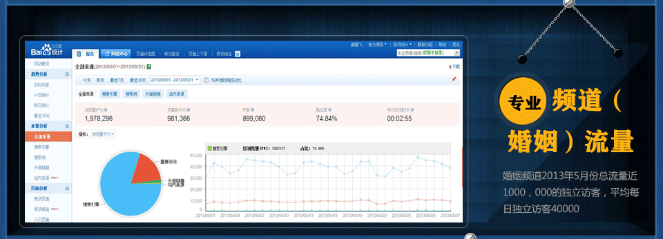 截止到2013年5月低,我們在百度有160,000的收錄,關(guān)鍵詞有120,000。整個5月份,我們的婚姻頻道有100多萬的訪客數(shù)(訪客數(shù),是指訪問的實際人數(shù)),其中有90%是通過搜索引擎搜索相關(guān)的關(guān)鍵詞來的,另外10%是直接訪問我們的網(wǎng)站或者在其他相關(guān)網(wǎng)站投放的廣告產(chǎn)生的,并且我們每月的訪客數(shù)還在不斷的增加。